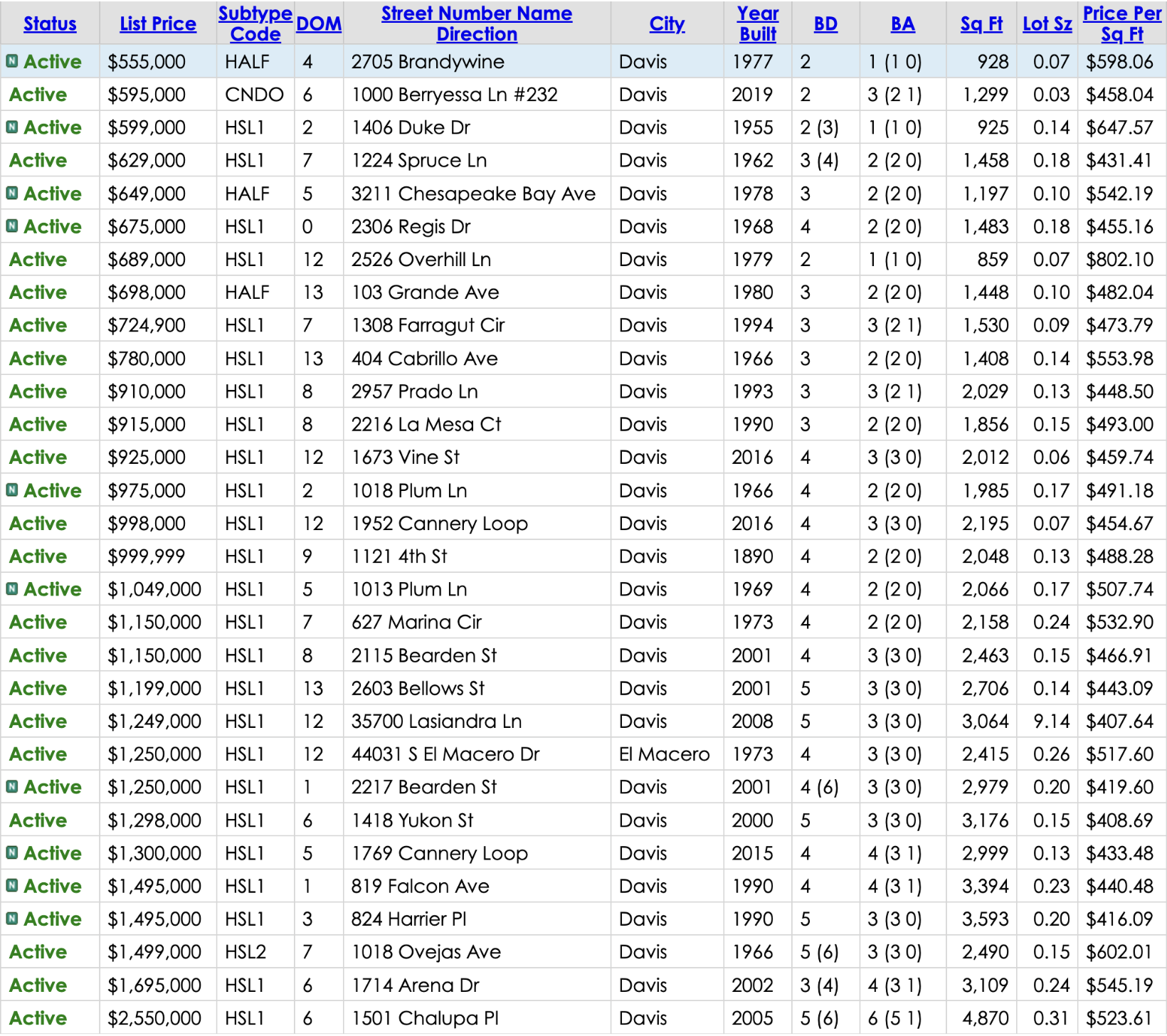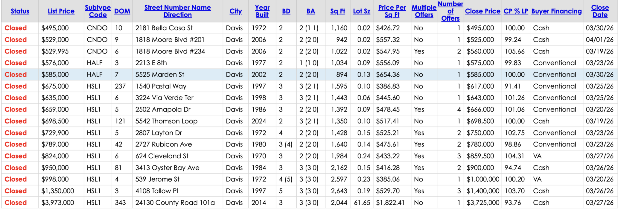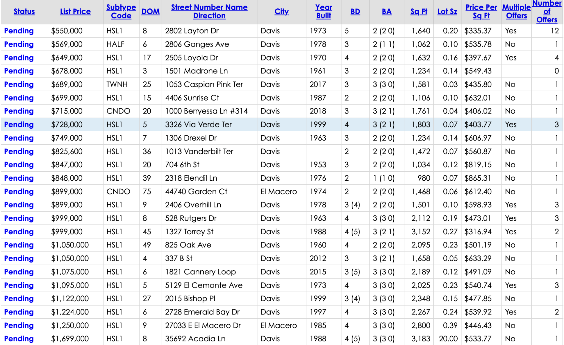 Hello, hello! It's that time of year - we went from a perfect weekend to rain. While a little rain is nice for mountain biking because it makes the trails "tacky" with less dust and more traction, it's a nuisance for listing homes! We schedule/reschedule window cleaning and photography because of the fluctuating weather! Anyway, I rode up in Nevada City late Sunday afternoon, and the trails were/are incredible. Well-marked, easy drive up/back, and almost entirely shaded. Conversely, we've been recalibrating our normally smooth process on an upcoming Lake Alhambra listing thanks to the April showers. Stay tuned for this gorgeous property which will be on the market next week. We had some busy open houses this weekend with Cannery Loop, Forbes, and Via Verde. Maria, Marcela and I always ask guests who come through if they get our market update and it's so gratifying when they say "yes!" I was looking at the stats before my open house on Saturday and was really surprised to see the inventory sitting at 100 in March. We usually don't hit triple digit inventory until late summer. There are currently 94 active and 37 pending properties on the market. We normally see the delta between active and pending listings shrink as we move into the busy part of the season. Curious what the next few months will bring. Over the past two weeks, we have seen the following:
