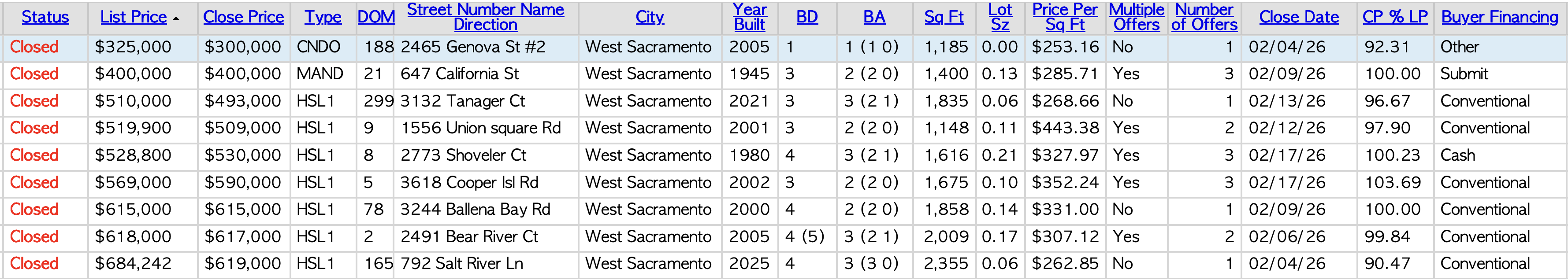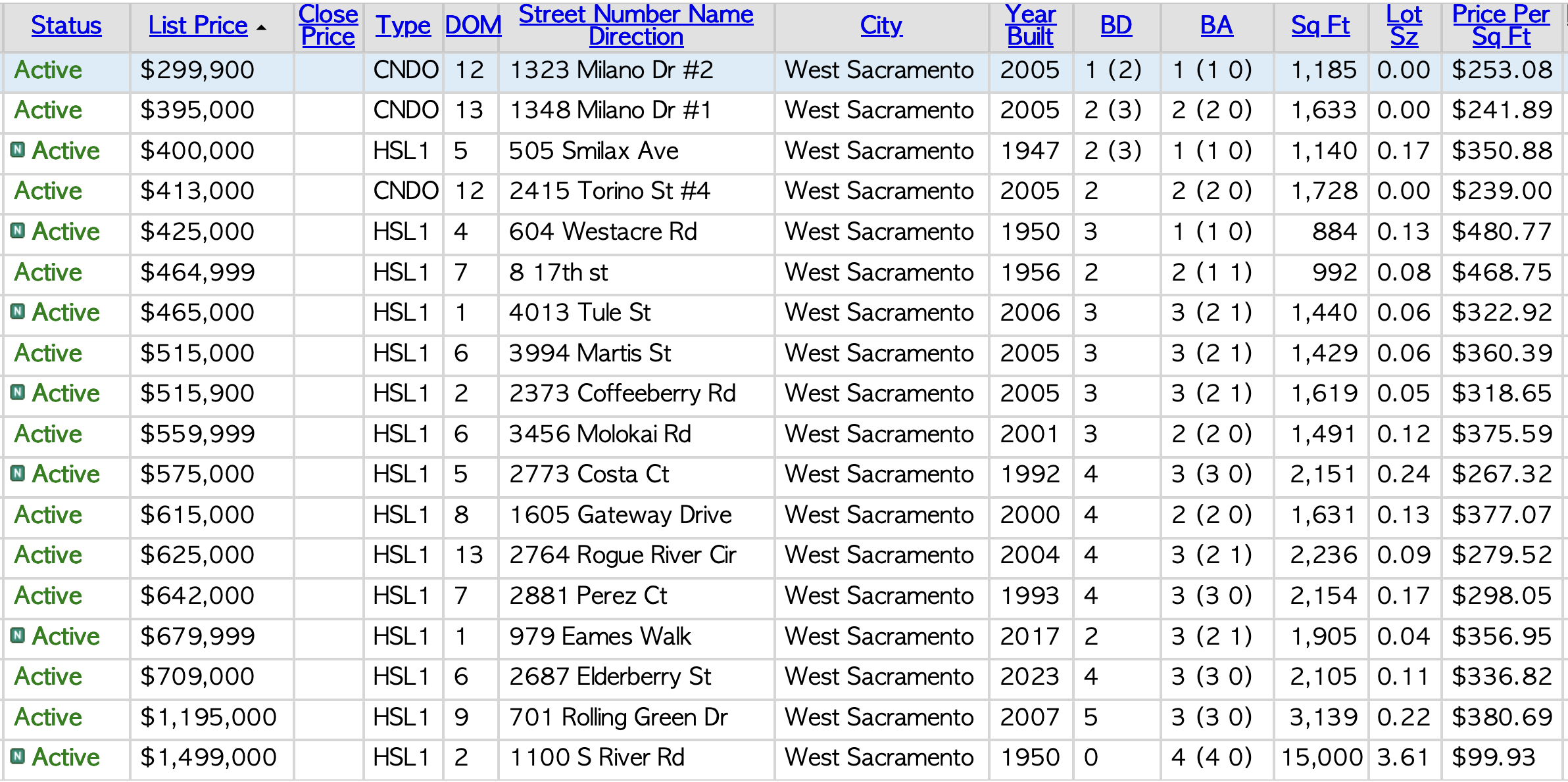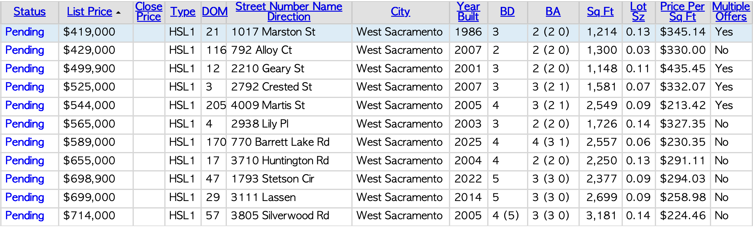 Over the past two weeks, we have seen the following in the West Sacramento market: