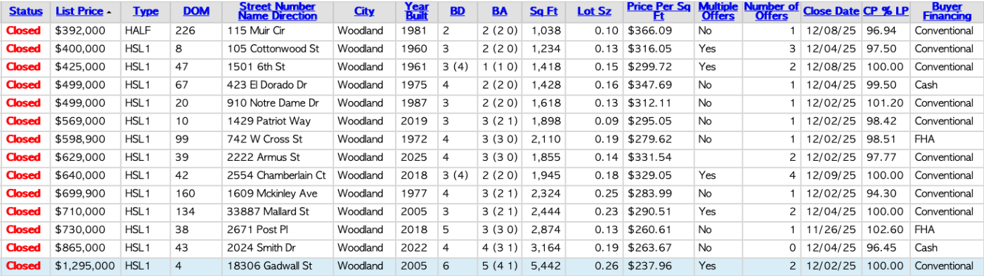 There has been a noticeable slowdown in new listings coming to market, that's typical for this time of year. For the year as a whole, Woodland has closed 399 properties in 2025, just 13 shy of the 411 closings in 2024.