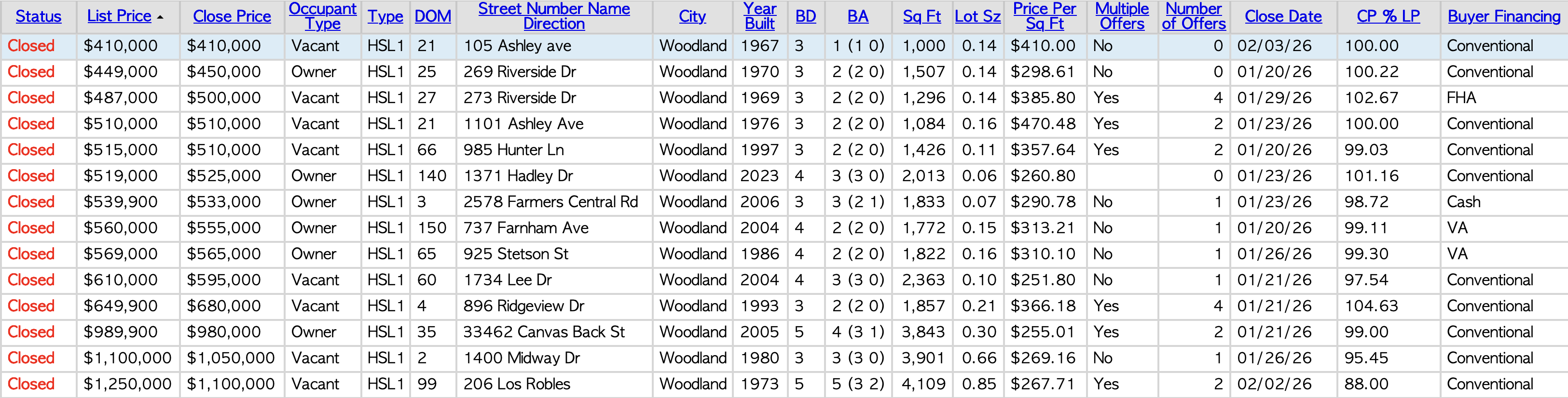 Hello, hello! I have officially completed 36 of my 75 day no alcohol challenge. I do this every year for the first 75 days to start the new year off by taking better care of my body! Thirty-six days is about half way and it has honestly been a breeze. I am very excited to cross this off my 2026 bingo card for this year. Now lets talk real estate! There are currently 55 active and 27 pending listings. Over the past two weeks, we have seen the following in the Woodland market: